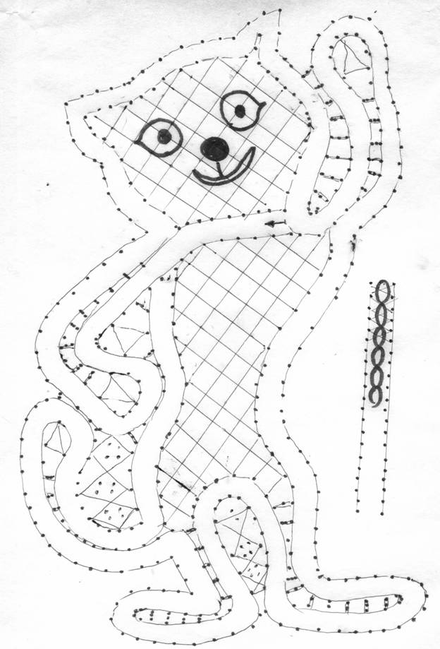 Начинаем плетение от 1-й булавки ходовой парой пара нить катушечная белая № 10, которая проплетает все пары. Полотнянка выполняется как полотнянка с перевивом крайних долевых пар. Заполнения и решеточка выполняются из ходовой и крайней долевой пар. Отдельно навешенными парами выполняются глазки, носик и ротик сувенира.